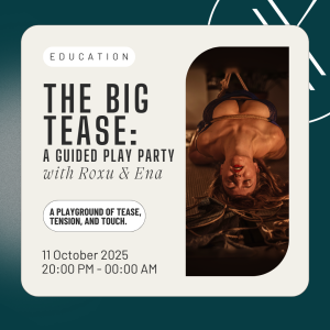 The Big Tease: A Guided Play Party with Roxu & Ena A playground of tease, tension, and touch. 11 Oct 8:00 pm - 12:00 am InFLUX IOR 2, Theodor Pallady 287, Bucharest