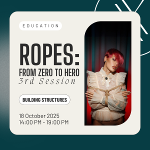 Ropes: From Zero to Hero – 3rd Session A bondage fast-track course that will level you up from your very first tie to finishing off your first suspension beautifully in just 5 sessions. 18 Oct 2:00 pm - 7:00 pm InFLUX IOR 2, Theodor Pallady 287, Bucharest