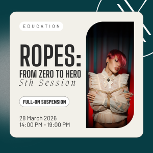 Ropes: From Zero to Hero – 5th Session A bondage fast-track course that will level you up from your very first tie to finishing off your first suspension beautifully in just 5 sessions. 28 Mar 2:00 pm - 7:00 pm InFLUX IOR 2, Theodor Pallady 287, Bucharest