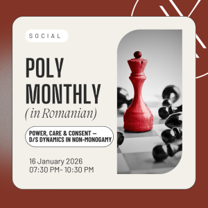 Poly Monthly: Power, Care & Consent — D/s Dynamics in Non-Monogamy (in Romanian) Poly Monthly is a social networking event in the non-monogamous community in Bucharest. Every month we get together to discuss an important topic related to non-monogamous relationships. 16 Jan 7:30 pm - 10:30 pm InFLUX IOR 2, Theodor Pallady 287, Bucharest